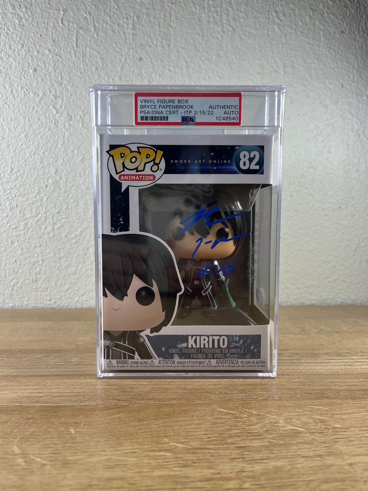 Kirito Funko Pop #82 from anime & manga Sword Art Online (SAO). This is a Vaulted Funko Pop! Encapsulated in an official PSA Hardstack Case! Autographed by Bryce Papenbrook, American voice actor for Kirito. Verified authentic autograph w/ PSA Certification Number: 1C48540. The box has PSA verification sticker & PSA Certificate of Authenticity (COA) verification card is also included.