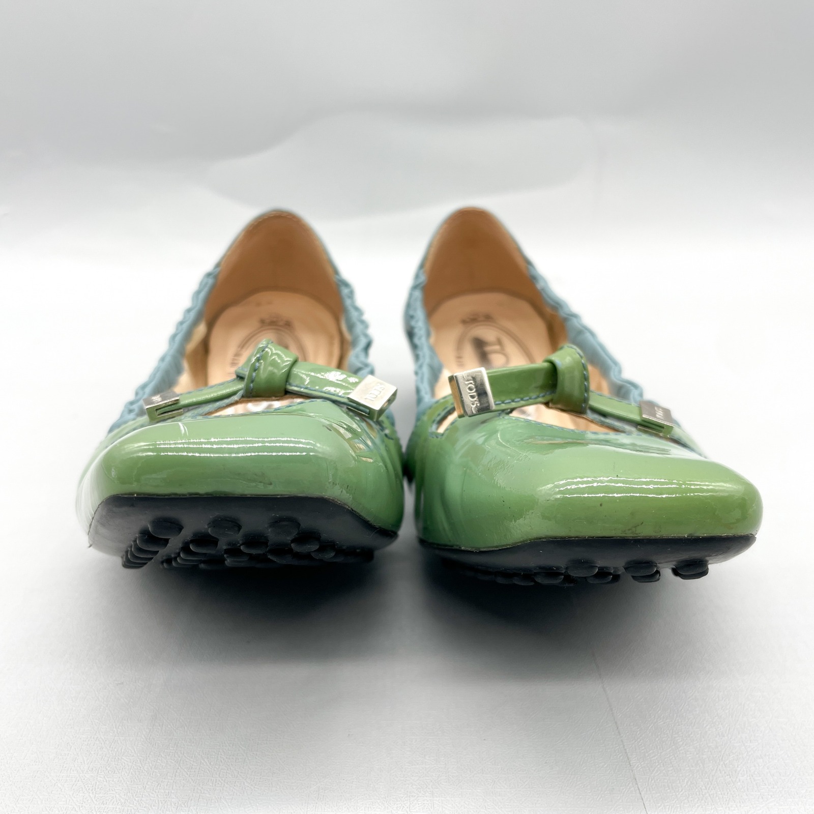 Tod's, ballet flats, flats, shoes, women's shoes, square toe, green, patent leather, designer shoes, luxury, size 37.5, green shoes, blue, leather flats, comfortable shoes