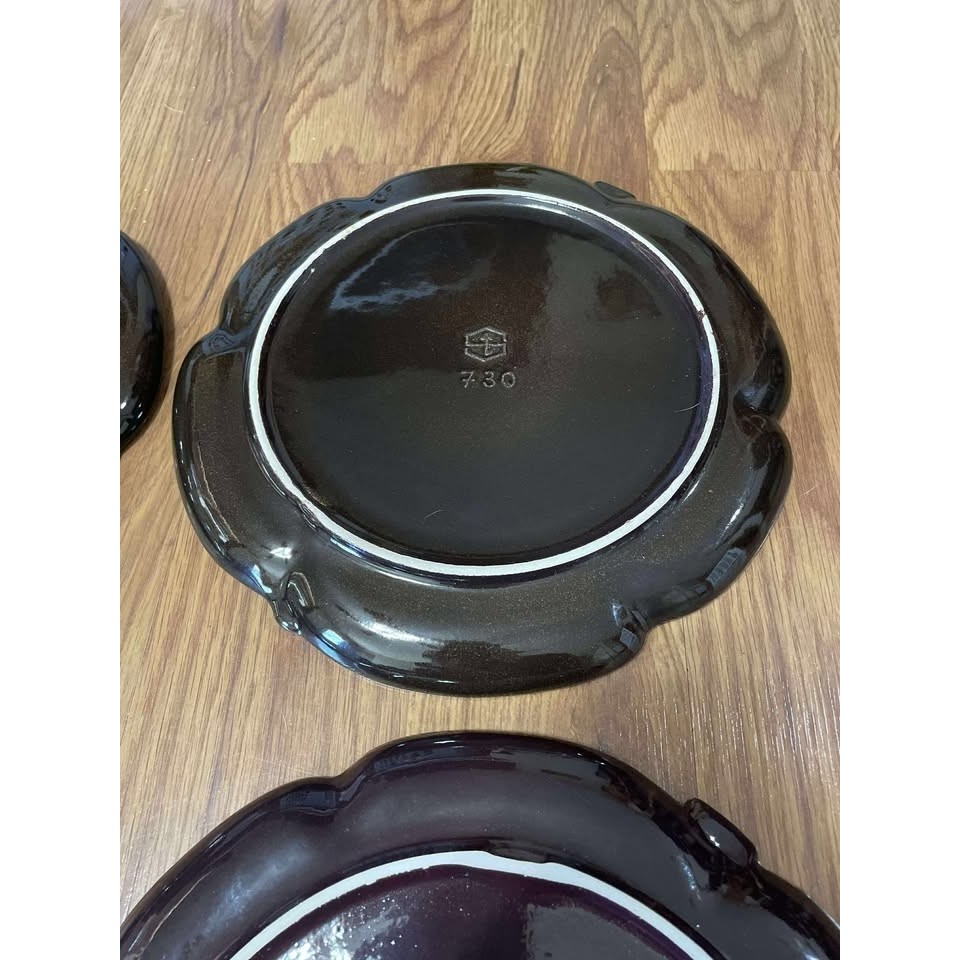 This vintage ceramic serving plates set features a retro design in a leaf shape, with a beige color, brown lining and decorative leaf pattern. Made in the 1980s using pottery techniques, these 10-inch plates are perfect for all occasions and are hand wash only to maintain their quality. The set includes 6 pieces, each with a unique vintage charm that adds a touch of nostalgia and earthy feel to your dining experience.